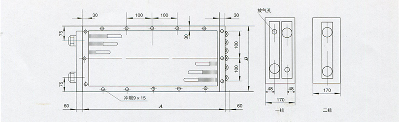 UⅡ型散热排管为半回路(一排)或双回路(二排)的空气热交换器,可加热或冷却空气。其肋片管绕制完毕后,需进行表面浸镀锡合金,以使肋片与管子接触紧密坚固,达到美观防腐的作用,结构特性见下表。